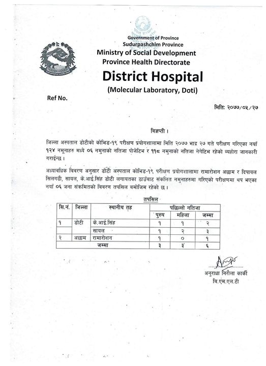प्रयोगशाला बि.एम.एल.टी. कार्किका अनुसार प्रयोगशालामा भएको परीक्षणमा डोटीको सायल गाउँपालिकाका ३ जना, केआईसिंह गाउँपालिकाका २ जना र अछाम जिल्लाको रामारोशन गाउँपालिकाका १ जनामा संक्रमण पुष्टि भएको हो ।