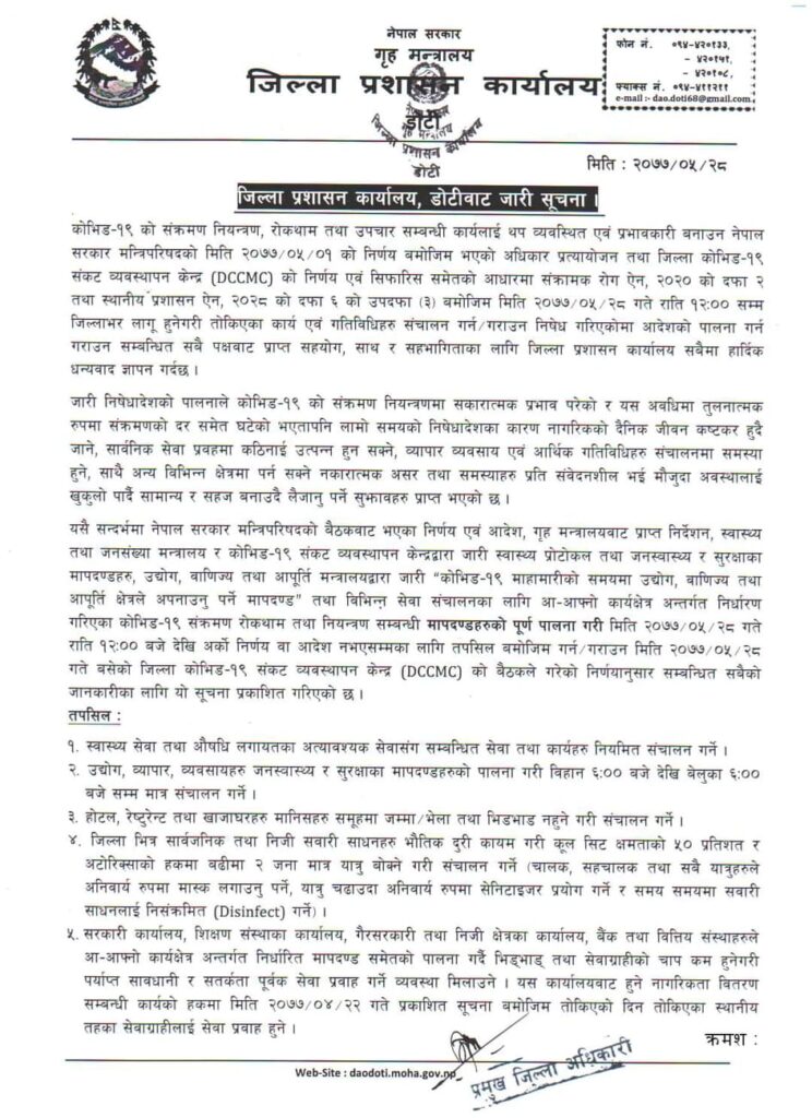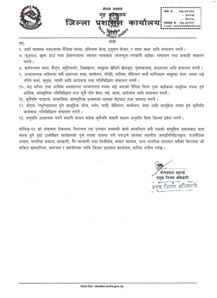 डोटी जिल्लामा पहिलो चरणमा भाद्र १४ गते देखि २१ गते सम्म निषेधाज्ञा जारी गरिएकोमा २१ देखी २८ गते राती १२ बजे सम्मका लागि थप गरिएको थियो ।