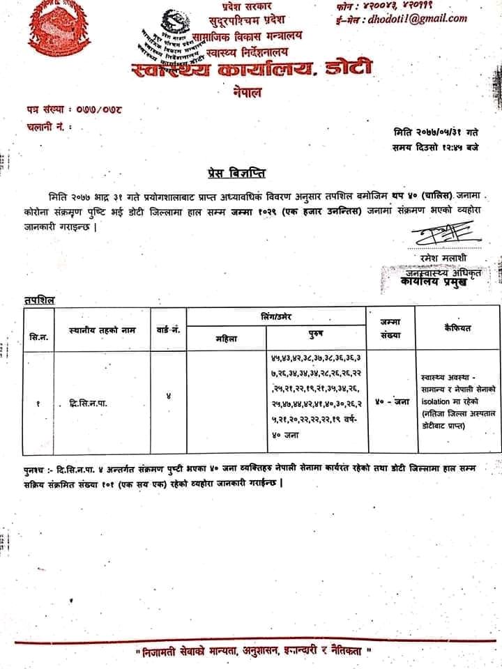 दिपायल सिलगढी नगरपालिका–४ सुल्लेकस्थित नेपाली सेनाको गुरुबक्स गणमा कार्यरत ४० जनामा संक्रमण देखिएको स्वास्थ्य कार्यालय डोटीका कार्यालय प्रमुख रमेश मलासीले जानकारी दिएका छन ।