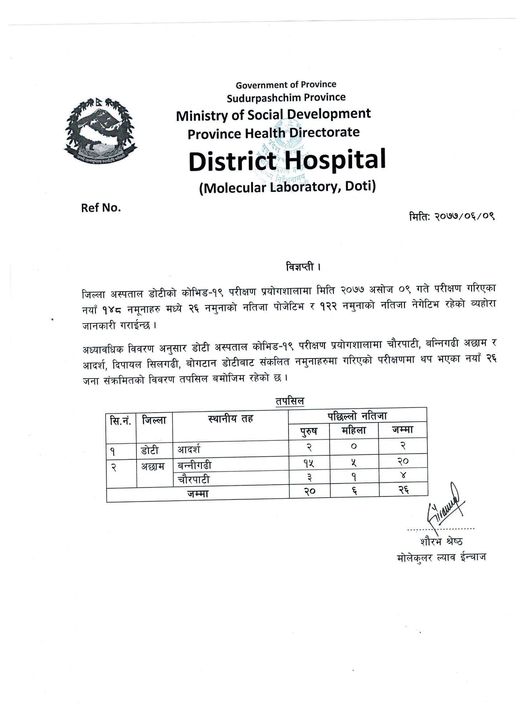प्रयोगशाला इन्चार्ज श्रेष्ठले दिएको जानकारी अनुसार डोटीका आदर्श गाउँपालीका २ जना, अछाम बान्नीगढीका २० र चौरपाटीका ४ जनामा गरि २६ जनामा कोरोना संक्रमण पुष्टी भएको हो ।