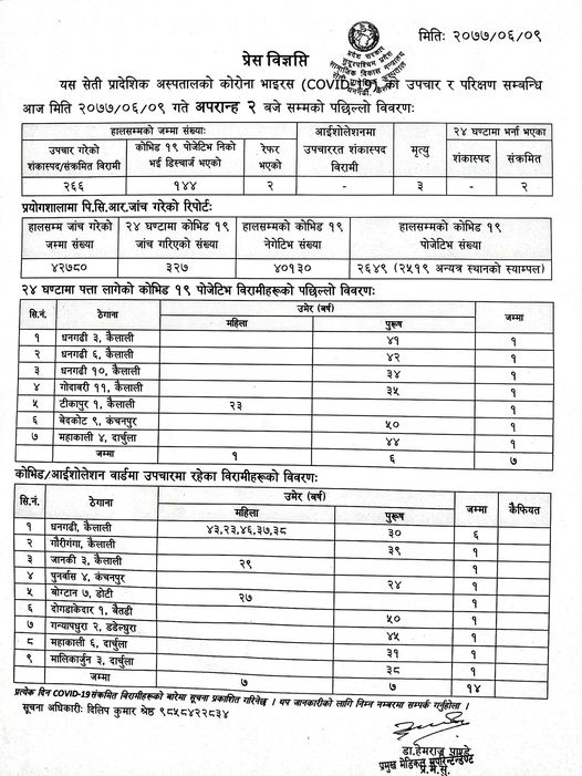 त्यसैगरि कञ्चनपुरको बेदकोटका ९ का १ जना र दार्चुलाका १ जना गरि ७ जनामा कोरोना पुष्टी भएको सेती प्रादेशीक अस्पतालका सुचना अधिकारी श्रेष्ठले बताए ।