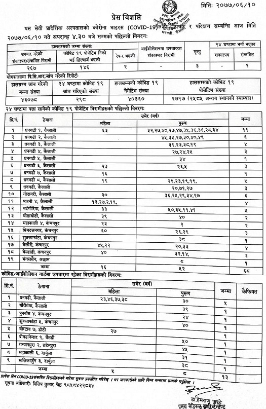 सेती प्रादेशिक अस्पतालका सूचना अधिकारी दिलिप कुमार श्रेष्ठले दिएको जानकारी अनुसार कैलालीका ५४ जना, कंचनपुरका १३ जना र अछामका १ जनामा क्रमण पुष्टि भएको छ ।