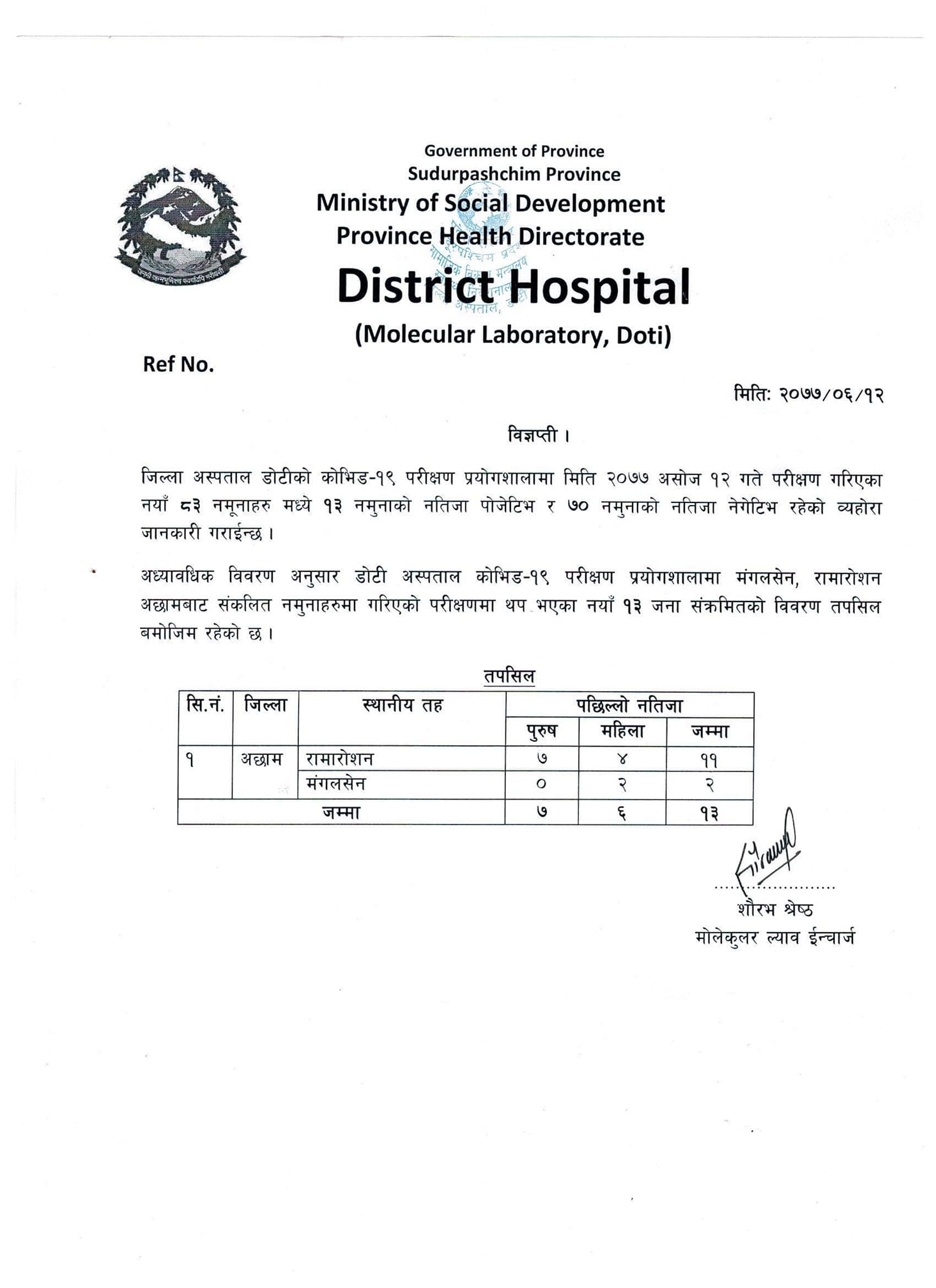 डोटी जिल्ला अस्पताल प्रयोगशालाका मोलेकुलर ल्याब इन्चार्ज सौरभ श्रेष्ठले अछाम रामारोसनका ११ जना र मंगलसेनका २ जनामा संक्रमण पुष्टि भएको बताए । उनका अनुसार सङ्क्रमितहरू मध्ये ७ पुरुष र ६ महिला रहेका छन् ।