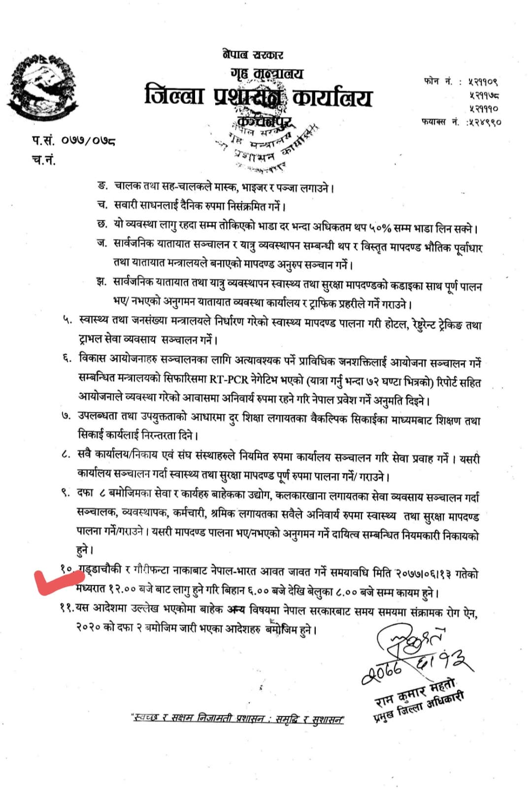 धनगढीसंग जोडिएको गौरीफन्टा र कंचनपुरको गड्डाचौकी नाका बिहान ६ देखि राति ८ बजेसम्म खुल्ने भएको छ। जिल्ला प्रशासन कार्यालय कञ्चनपुरले असोज १३ गते मध्यराती १२ बजेबाट लागु हुनेगरी देखि बिहान १० देखि बेलुका ५ बजेसम्म खोल्ने निर्णय गरिएको जनाएको हो।