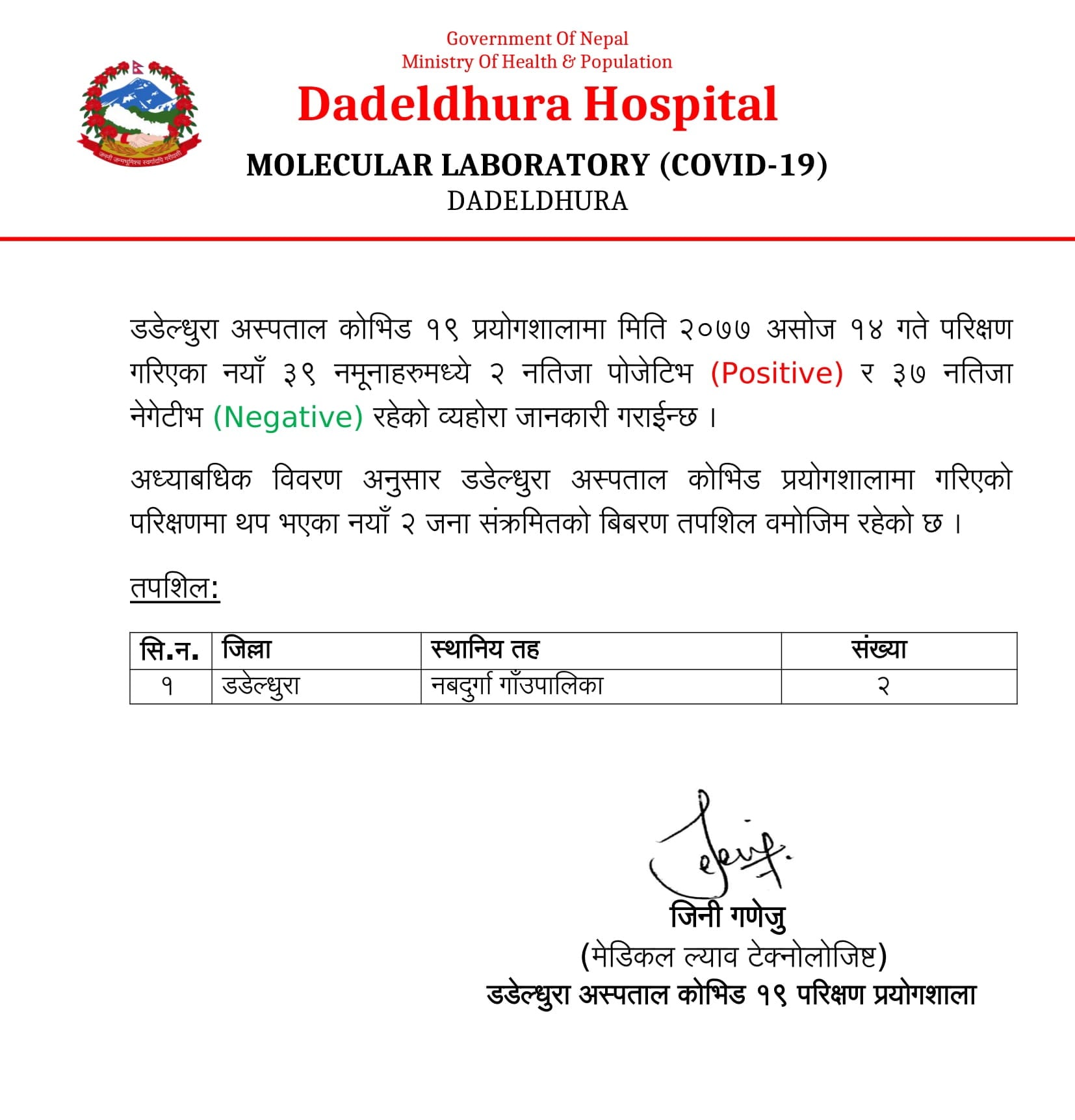अस्पतालका प्रयोशाला इन्चार्ज जिनी गणेजुका अनुसार कोरोना संक्रमण पुष्टि हुनेमा डडेल्धुराकै नवदुर्गा गाउँपालिकाका २ जना रहेका छन् ।