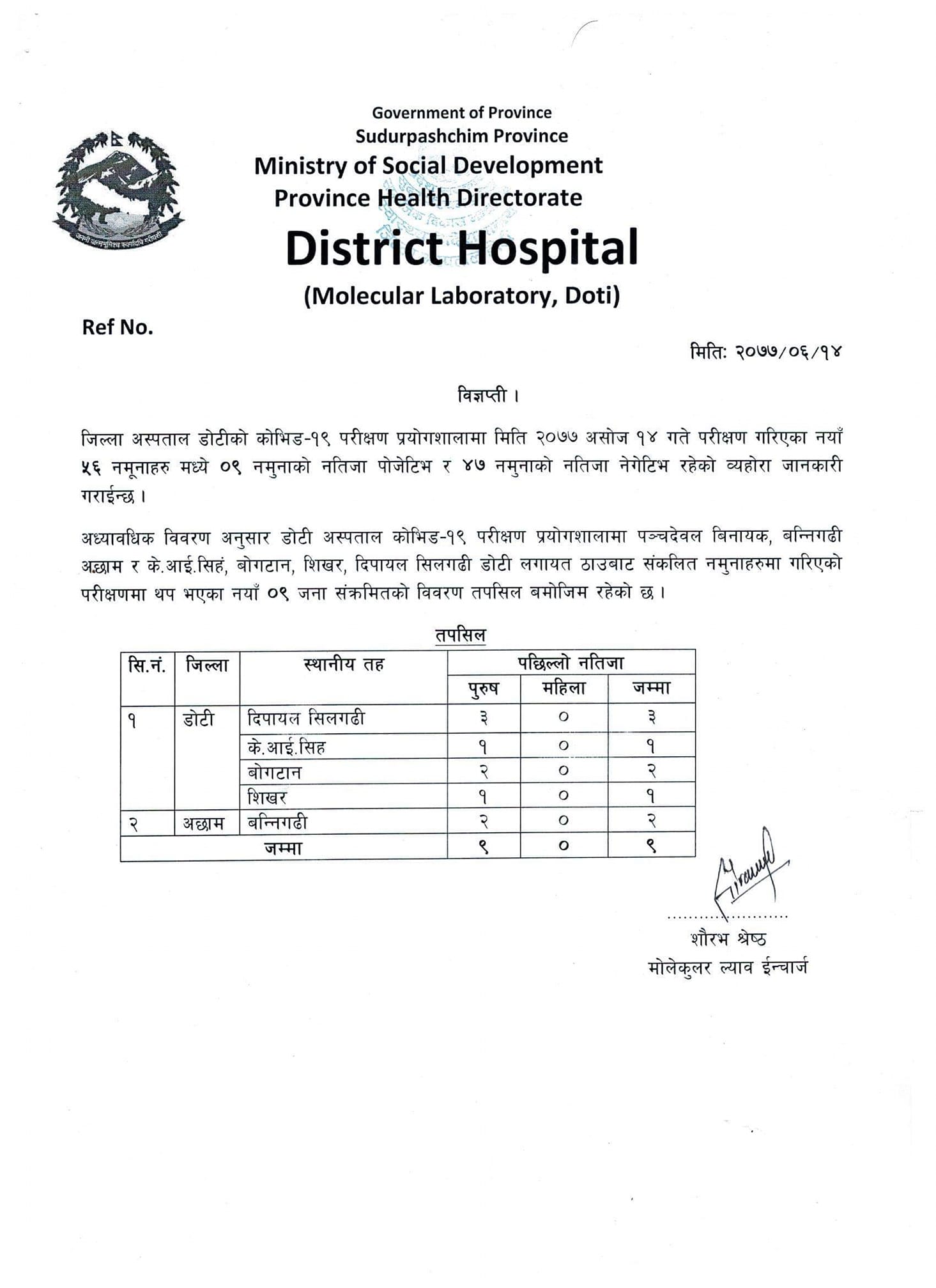 डोटी अस्पतालको प्रयोगशालामा थप ९ जनामा कोरोना पुष्टि
