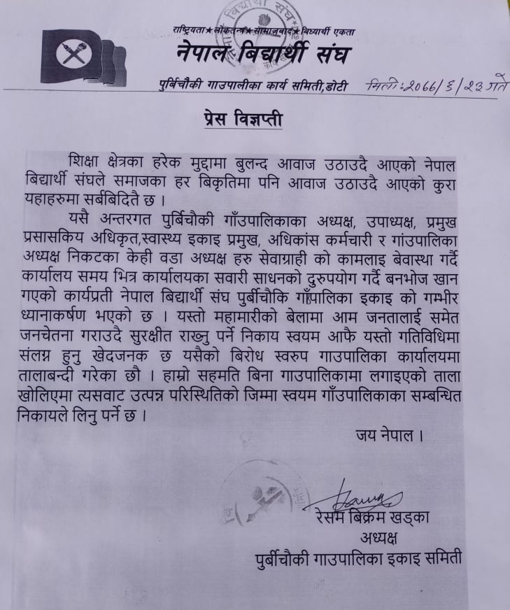 पुर्बीचौकी गाउँपालिकाको कार्यालयमा शुक्रबार नेविसंघले तालाबन्दी गरेको छ । जनप्रतिनिधी र कर्मचारीहरु कार्यालय समयमा जनताका कामलाई बेवास्ता गरि पिकनिक खान गएको भन्दै तालाबन्दी गरेको नेविसंघ पुर्बी चौकी गाउँपालिका इकाईका अध्यक्ष रेशम बिक्रम खड्काले जानकारी दिए ।