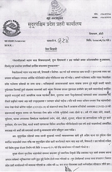 चाडपर्वलाई मर्यादित बनाउन र शान्ति सुरक्षाको अवस्था बलियो बनाउन सहयोग गर्न समेत प्रदेशबासीमा प्रहरीले अनुरोध गरेको छ ।