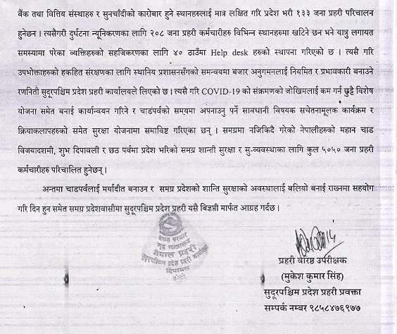 दशैँ, तिहार तथा छठ पर्वलाई मध्यनजर गरी बनाईएको विशेष सुरक्षा योजना अन्तरगत अपराध नियन्त्रणका लागि विशेष टोलीहरु परिचालन गरिएको सुदूरपश्चिम प्रदेश प्रहरी कार्यालयका प्रवक्ता प्रहरी वरिष्ठ उपरिक्षक मुकेशकुमार सिहले जानकारी दिए ।