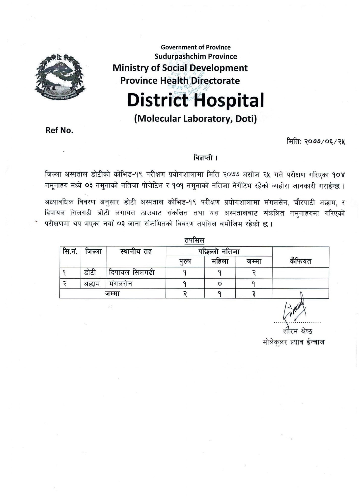 अस्पतालका प्रयोगशाला इन्चार्ज शौरभ श्रेष्ठले डोटीको दिपायल सिलगढी नगरपालिकाका १ जना पुरुष, १ महिला गरी २ जना र अछामको मंगलसेन नगरपालिकाका १ जनापुरुषमा कोरोना संक्रमण भेटिएको बताएका छन् ।