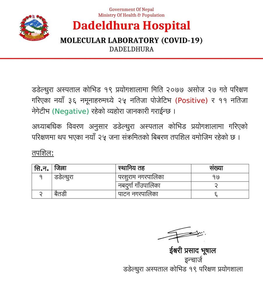 डडेल्धुरा अस्पतालको प्रयोगशालामा थप २५ जनामा कोरोना संक्रमण पुष्टि