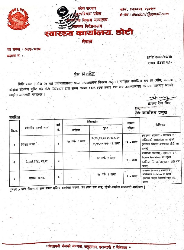डोटी अस्पतालका ल्याव ईन्चार्ज शौरभ श्रेष्ठका अनुसार डोटीको शिखर नगरपालिकाका १२ जना सायल र केआइसींह गाउँपालीकाका १ / १ जनामा गरि १४ जनमा कोरोना संक्रमण पुष्टी भएको हो ।