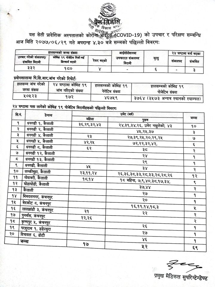 अस्पतालका सूचना अधिकारी दिलीप कुमार श्रेष्ठका अनुसार ५६ जना कैलालीका मात्रै कोरोना संक्रमण पुष्टि भएका छन् । कञ्चनपुरका १२ जना, डोटी र डडेल्धुराका १/१ जना गरि ६९ जना रहेका सेती प्रादेशीक अस्पतालका सुचना अधिकारी दिलीप कुमार श्रेष्ठले बताए ।
