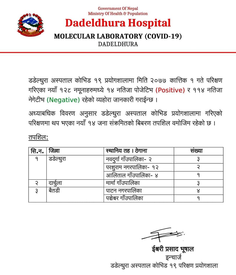 डडेल्धुरा स्पतालको प्रयोगशालामा थप १४ जनामा कोरोना संक्रमण पुष्टि