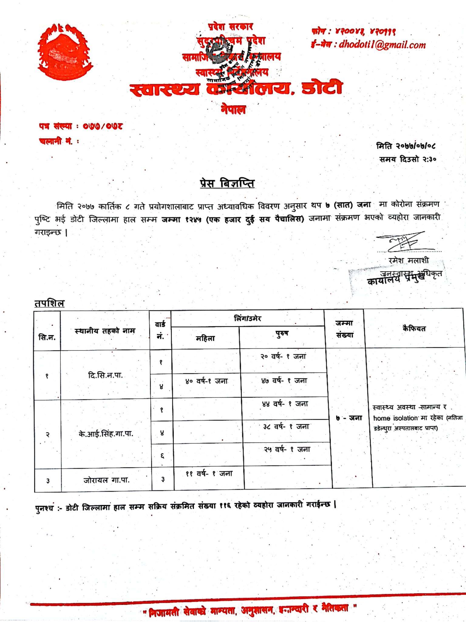 दिपायल सिलगढी नगरपालिका वडा नम्वर १ का २० वर्षका १ जना पुरुष, वडा नम्बर ४ का ४७ वर्षका १ पुरुष र ४० वर्षीया १ महिला, के.आई.सिंह गाँउपालिका वडा नम्वर १ का ४४ वर्षका १ जना पुरुष, वडा नम्वर ४ का ३८ वर्षका १ जना पुरुष, वडा नम्वर ६ का २५ वर्षका १ पुरुष र जोरायल गाँउपालिका वडा नम्वर ३ की ११ वर्षीया १ बालीकामा कोरोना पुष्टि भएको छ ।