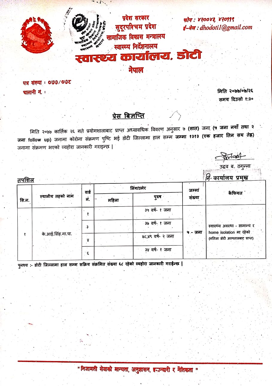 डोटी अस्पतालका निमित्त प्रमुख उद्ब बहादुर ठगुन्नाले दिएको जानकारी अनुसार डोटीको केआई सिह गाउपालिका वाड नम्बर १ का १ जना, वाड नम्बर ३ का १ जना, वाड नम्बर ४ का २ जना र वाड नम्बर ६ का १ जनामा कोरोना संक्रमण पुष्टी भएको छ ।