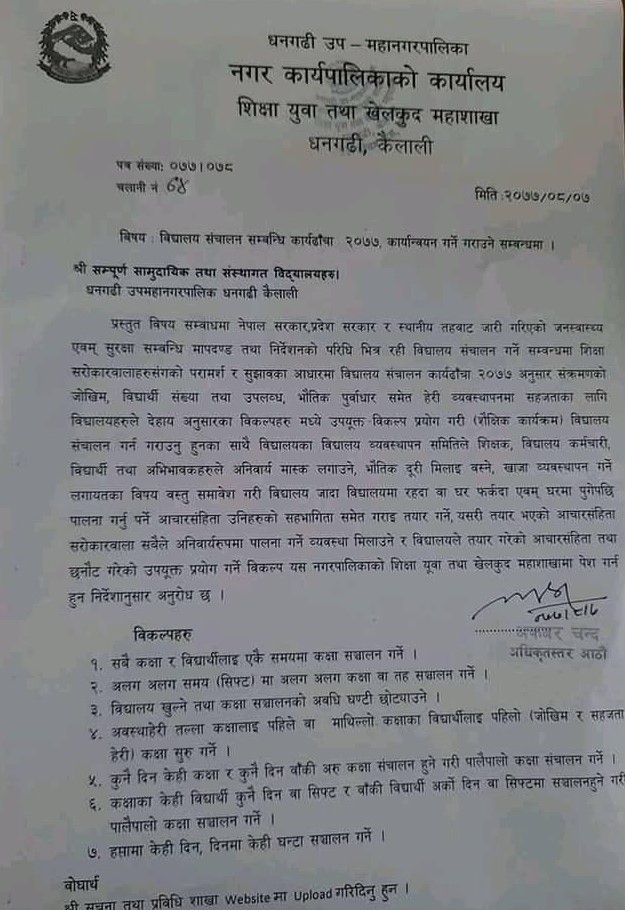स्वास्थ्य सुरक्षाका मापदण्डको पालन गरी पठनपाठन सञ्चालन गर्न विद्यालयलाई अनुमति दिएको छ । धनगढी उप–महानगरपालिकाले आइतबार सामुदायिक तथा संस्थागत विद्यालयहरुलाई पत्राचार गर्दै स्वास्थ्य सुरक्षाका मापदण्ड अपनाउँदै पठनपाठन सञ्चालन गर्न अनुमति दिएको हो ।