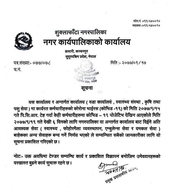 कञ्चनपुरको शुक्लाफाँटा नगरपालिका कार्यालयले एक हप्तासम्मका लागि अत्यावश्यक बाहेकका सबै सेवा प्रवाह स्थगित गरेको छ । नगरपालिकाले एक सूचना जारी गर्दै आइतबार (१९गते)देखि एक हप्तासम्मका लागि अत्यावश्यक बाहेकका सबै सेवा बन्द गरिने जनाएको हो ।