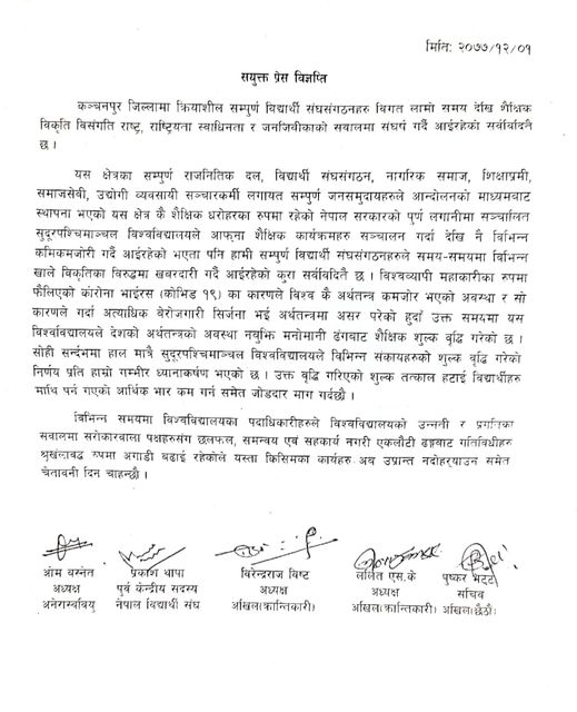 “हालैमात्र सुदूरपश्चिमाञ्चल विश्वविद्यालयले विभिन्न संकायहरुको शुल्क वृद्धि गरेको निर्णय प्रति हाम्रो गम्भीर ध्यानाकर्षण भएको छ,” पाँच विद्यार्थी संगठनहरुले जारी गरेको संयुक्त विज्ञप्तिमा भनिएको छ, “उक्त वृद्धि गरिएको शुल्क तत्काल हटाइ विद्यार्थीहरुमाथि पर्न गएको आर्थिक भार कम गर्नससेत जोडदार माग गर्दैछौं ।”