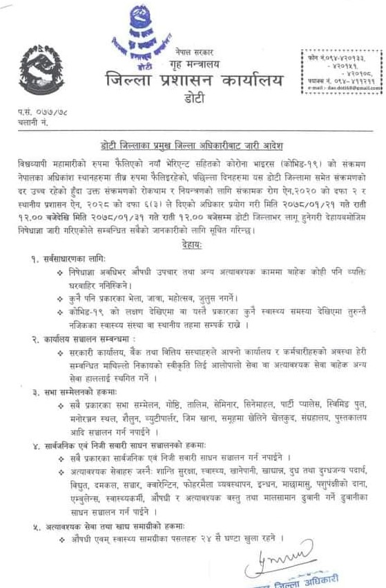 जिल्ला प्रशासन कार्यालय डोटीका प्रमुख सुनील खनालले बैशाख २१ गते राती १२ बजे देखि वैशाख ३१ गते राती १२ बजे सम्म निषेधाज्ञा जारी हुने बताएका छन् ।