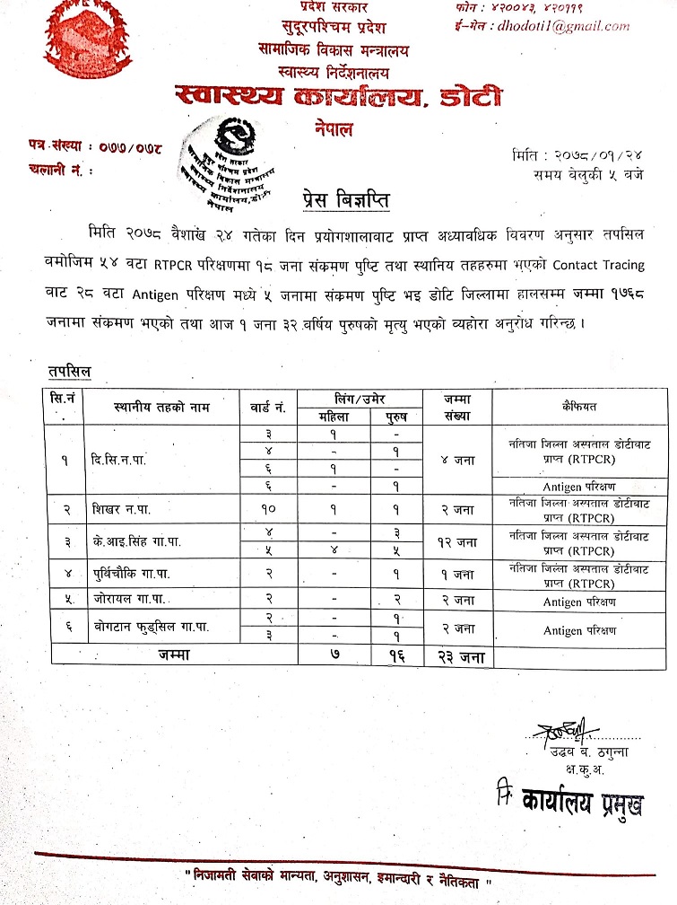 जिल्ला स्वास्थ्य कार्यालय डोटीका निमित्त प्रमुख उद्बब बहादुर ठगुन्नाका अनुसार दिपायल सिलगढी नगरपालिकामा ४, शिखर नगरपालिकामा २, केआइृ सिह गाउपालिकामा १२, पुर्बिचौकी गाउपालिकामा १, जोरायल गाउपालिकामा २ र बोगटान फुड्सिल गाउपालिकामा २ जनागरी २३ जनामा कोरोना संक्रमण पुष्टि भएको हो ।