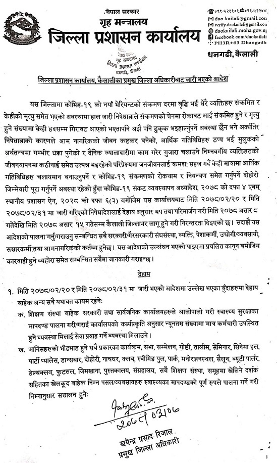 जिल्ला प्रशासन कार्यालय कैलालीका सूचना अधिकारी जोशीका अनुसार कोरोना महामारीको दोस्रो लहर सुरु भएपछि कैलालीको स्थानीय प्रशासनले बैशाख १६ गतेदेखि क्रमिक रुपमा निषेधाज्ञा थप्दै आएकोमा अब असार १५ गतेसम्म निषेधाज्ञा लम्बाईएको हो ।