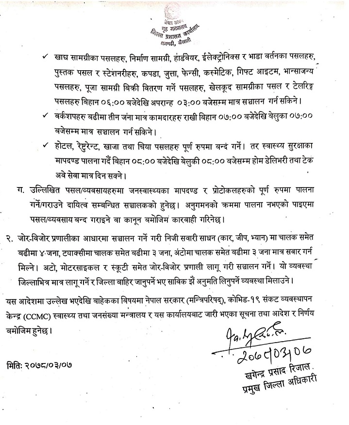 यस्तै सार्वजनिक यातायात, सभा सम्मेलन, होटल, सामूहिकमा गरिने कार्यलाई भने अझै सञ्चालनमा रोक लगाइने कैलाली प्रशासनले जनाएको छ । असार ८ गतेदेखि भने स्वास्थय मापदण्ड अपनाएर सरकारी कार्यालय सञ्चालन गर्ने समेत निर्णय भएको सूचना अधिकारी जोशीले जानकारी दिए । बिहान ११ बजे सम्म खुल्ला रहदै आएका सबै पसल यथावत सञ्चालन गर्न सकिने समेत जनाएको छ ।