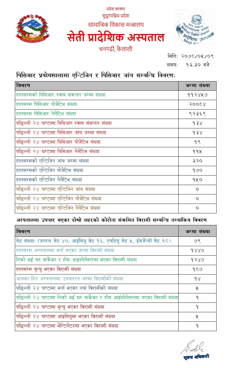 सेती प्रादेशिक अस्पतालका सूचना अधिकारी दिलिपकुमार श्रेष्ठका अनुसार ११५ जनाको रिपोर्ट निगेटिभ आएको छ । पछिल्लो २४ घण्टामा अस्पतालमा ५ जना अस्पतालमा भर्ना भएका छन् । भने १ जना अस्पतालबाट डिस्चार्ज भएका छन् । हाल अस्पतालमा १४ जना संक्रमित उपचाररत छन्।