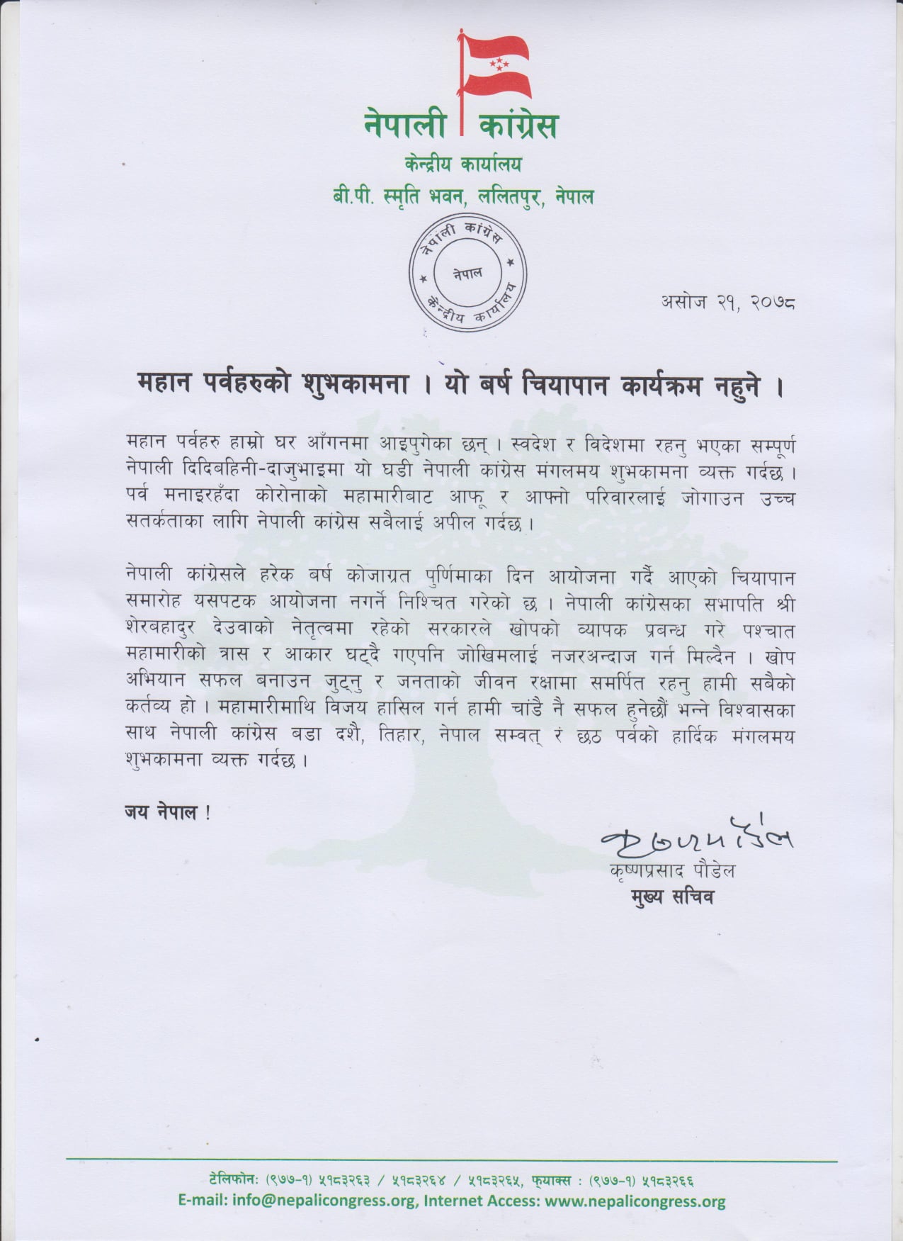 बिहीबार कांग्रेस पार्टी कार्यालयका मुख्यसचिव कृष्णप्रसाद पौडेलले बिहीबार विज्ञप्ति जारी गर्दै कोरोना महामारीको जोखिमलाई मध्यनजर गरेर चियापान कार्यक्रम नगर्ने जनाएका हुन् ।