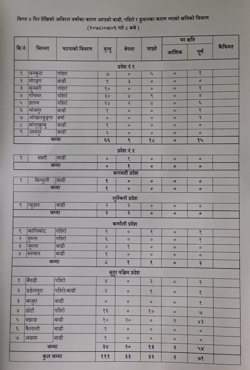 प्रदेश १ मा ६६ जना, सुदूरपश्चिम प्रदेशमा ३४ जना, कर्णाली प्रदेशमा ८ जना, लुम्बिनी प्रदेशमा दुई जना र बागमती प्रदेशमा एकजना गरी जम्मा १११ जनाको मृत्यु भएको हो।