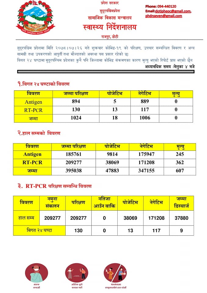 सुदूरपश्चिम प्रदेश स्वास्थ्य निर्देशनालयका अनुसार आरटी पीसीआर १३ र एन्टीजेन बिधिमार्फत ५ जनामा कोरोना संक्रमण देखिएको हो । पीसीआर बिधिमार्फत सेती प्रादेशिक अस्पतालमा १२ र महाकाली अस्पतालमा एक जनामा कोरोना संक्रमण देखिएकोनिर्देशनालयले जनाएको छ । यस्तै एन्टीजेन बिधिमार्फत कैलालीका तीन र कञ्चनपुरका दुई जनामा कोरोना संक्रमण पुष्टि भएको छ ।