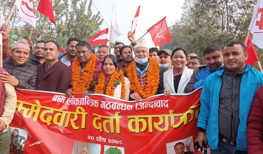 निर्वाचन आयोगले आज बिहान १० देखि ३ बजेसम्म मनोनयन दर्ताको समय तोकिएको थियो । निर्वाचन कार्यालय कैलालीका अनुसार गठबन्धनका तर्फबाट नेपाली काँग्रेसको तर्फबाट खुल्लामा कैलालीका नारायण मिश्र, माओवादी केन्द्रका तर्फबाट दलितमा डडेल्धुरका जगत पार्की र एकीकृत समाजवादीका तर्फबाट महिलामा गरिमा शाहले मनोनयन दर्ता गरेका हुन् ।