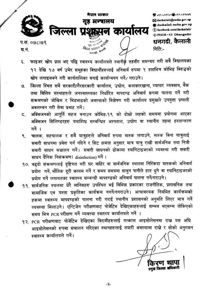 धनगढी : कोरोना संक्रमणलाई मध्यनजर गर्दै जिल्ला प्रशासन कैलालीले १२ बुँदे आदेश जारी गरेको छ । कोभिड–१९ को बढ्दो संक्रमणलाई मध्यनजर गर्दै जिल्ला प्रशासन कार्यालय कैलालीले स्मार्ट लकडाउन सहित कडाइ गरेको हो ।