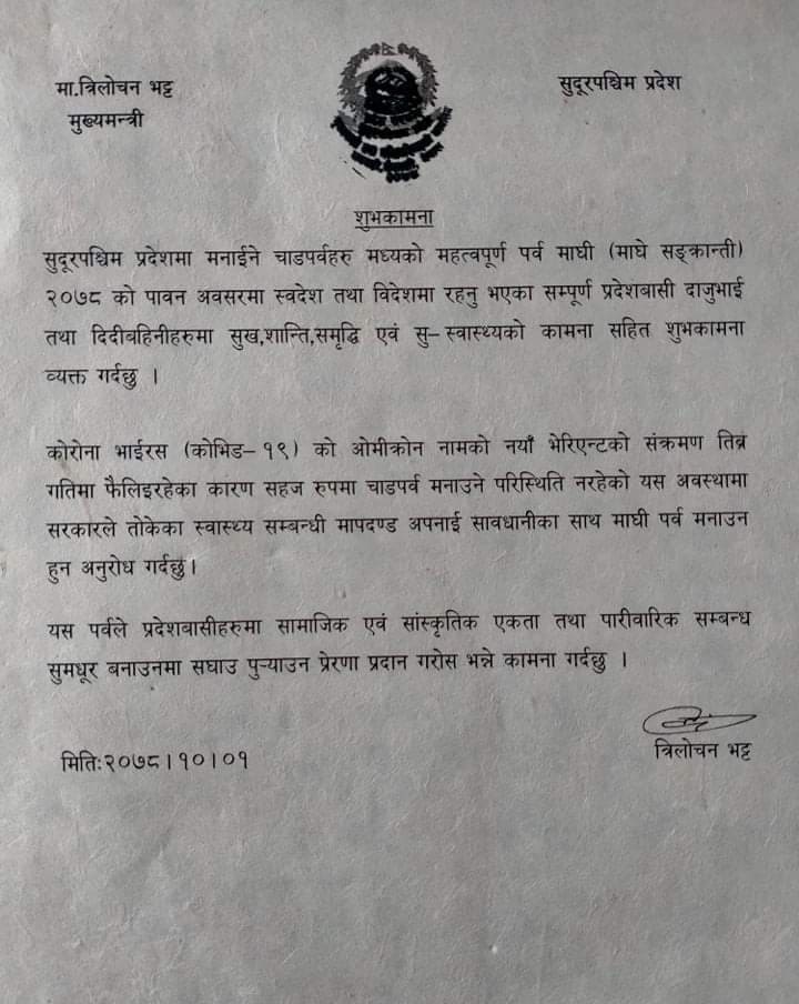 स्वास्थ्यका मापदण्ड पालना गरी माघी मनाउन मुख्यमन्त्री भट्टको आग्रह