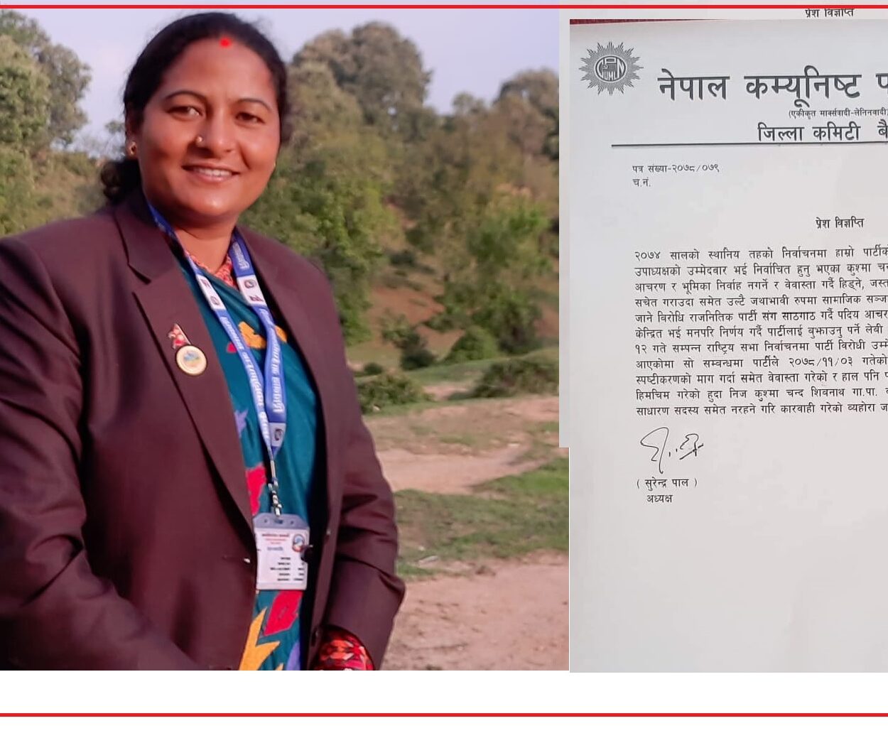 “पार्टीको निर्देशनबमोजिम पदीय आचरण र भूमिका निर्वाह नगर्ने र बेवास्ता गर्दै हिँड्ने, सामाजिक सञ्जालमा पार्टीको नीति, नेतृत्वविरुद्ध जाने र विरोधी पार्टीसँग साँठगाँठ गरी पदीय आचरणको दुरुपयोग गरेको भेटिएको छ”, जिल्ला अध्यक्ष सुरेन्द्र पाल र सचिव चक्र कार्कीद्वारा हस्ताक्षरित विज्ञप्तिमा भनिएको छ, “हाल पनि विरोधी पार्टीसँग हिमचिम गरेकाले पार्टीको साधारण सदस्यसमेत नरहने गरी कारबाही गरिएको छ ।”