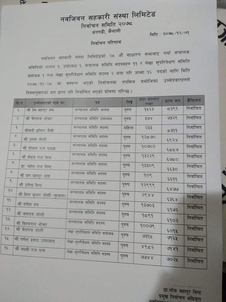 नवजीवन सहकारी संस्था धनगढीको अध्यक्षमा बम विजयी, को-को भए निर्वाचित ?