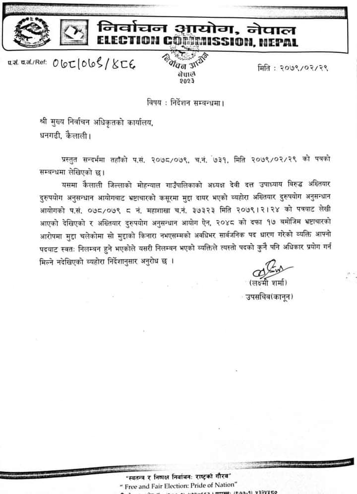 अख्तियार दुरुपयोग अनुसन्धान आयोग ऐन २०४८ को दफा १७ बमोजिम भ्रष्टाचारको आरोपमा मुद्दा चलेकोमा सो मुद्दाको किनारा नभएसम्मको अवधिभर सार्वजनिक पदधारण गरेको व्यक्ति आफ्नो पदबाट स्वतः निलम्बन हुने भएकाले यसरी निलम्बनमा भएको व्यक्तिले त्यस्तो पदको कुनै पनि अधिकार प्रयोग गर्न मिल्ने नदेखिएको व्यहोरा निर्देशनुसार अनुरोध छ’ सो पत्रमा भनिएको छ । उनी निलम्बनमा परे पछि सोमबार हुन लागेको जिल्ला समन्वय समितिको निर्वाचनमा मतदान गर्न पाउने छैनन् ।
