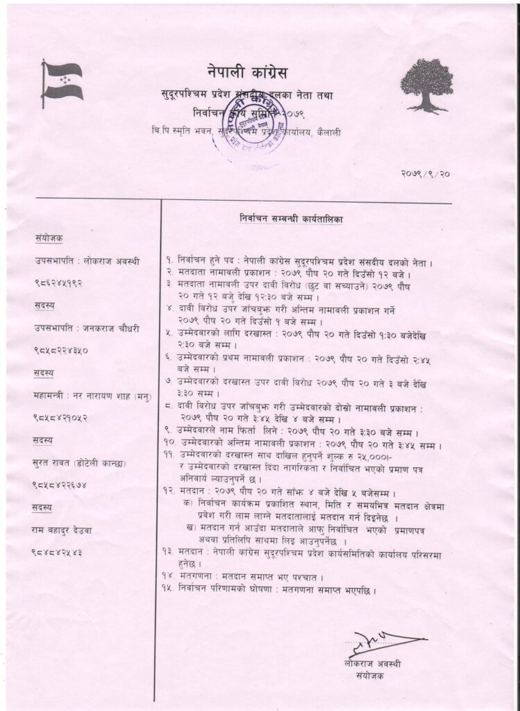 नेपाली कांग्रेस सुदूरपश्चिम प्रदेश समितिले दलको नेता चयन गर्नका लागि पार्टीका उपसभापति लोकराज अवस्थीको संयोजकत्वमा पाँच सदस्यीय निर्वाचन समिति गठन गरेको छ ।