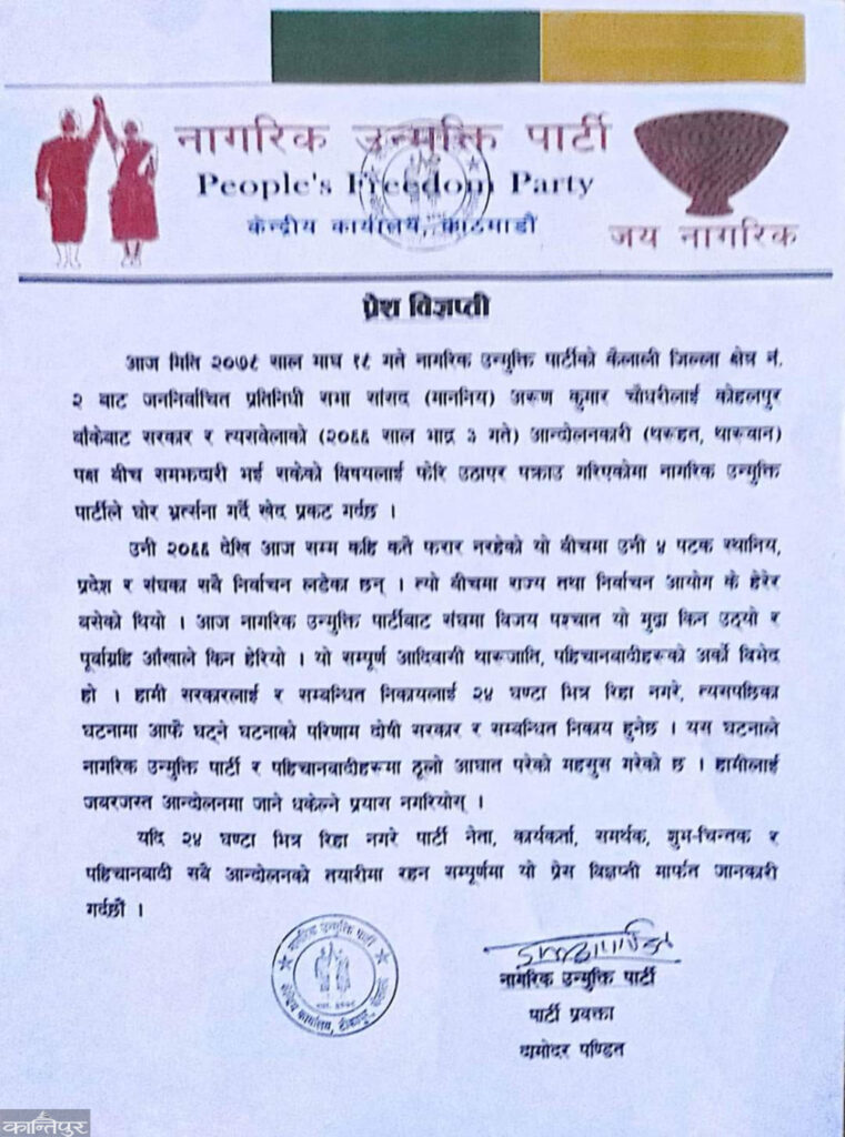 नागरिक उन्मुक्ति पार्टीले फौजदारी अभियोगमा दोषी ठहर भएका सांसद अरुणकुमार चौधरीलाई पक्राउ गरेको विरोध गर्दै २४ घन्टाभित्र छोड्न अल्टिमेटम दिएको छ ।