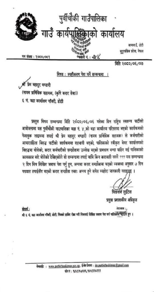 डोटी। डोटीको पुर्वीचौकी गाउँपालिकाले एक कर्मचारीलाई स्पष्टीकरण सोधेको छ। कृषि करार सेवा अन्तरगत कार्यरत प्रेमबहादुर भण्डारीले पार्टीको कार्यक्रममा सहभागी भएर तथानाम बोलेका कारण स्पष्टीकरण सोधेको हो।