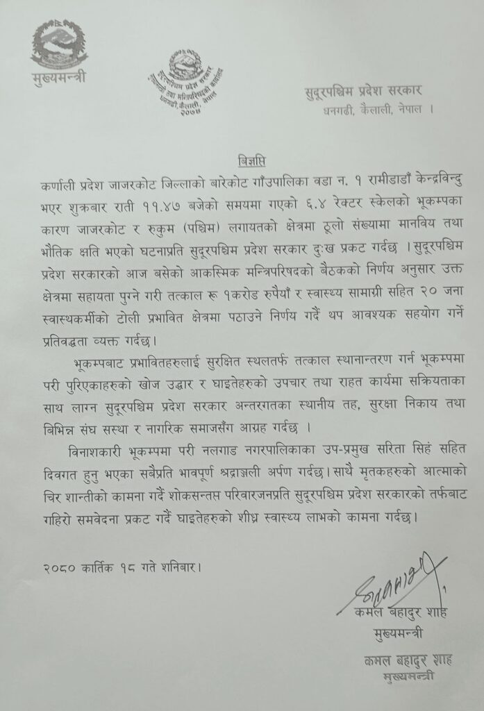धनगढीमा शनिबार विहान आयोजित पत्रकार सम्मेलनमा मुख्यमन्त्री कमलबहादुर शाहले गएराति जाजरकोट जिल्लालाई केन्द्रबिन्दु बनाएर गएको भूकम्पको कारण ठुलो धनजनको क्षतिप्रति गहिरो दुःख व्यक्त गर्दै सहयोग गर्ने निर्णय गरेको बताएका हुन ।