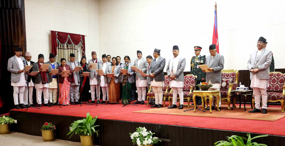 तीन उपप्रधानसहित १६ जना मन्त्रीलाई शपथ गराउँदै १९ मन्त्रीको मन्त्रालय तोकिएको हो । सोमबार नै शपथ लिएका ३ मन्त्रीको पनि मन्त्रालय तोकिएको छ । उपप्रधानसहित भौतिक पूर्वाधार तथा यातायात, परराष्ट्र र गृहमन्त्रीमा क्रमशः एमाले सचिव रघुवीर महासेठ, माओवादी केन्द्रका उपाध्यक्ष नारायणकाजी श्रेष्ठ र रास्वपा सभापति रवि लामिछानेले पदभार ग्रहण गरेका छन् । यी तीन उपप्रधानमन्त्री यसअघि पनि मन्त्री भइसकेका छन् ।