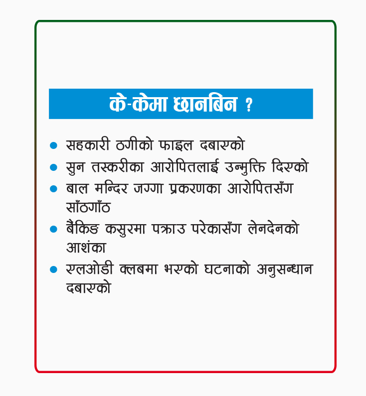 त्यस्तै ज्ञवालीमाथि छानबिन भइरहेका अन्य आधा दर्जन विषय छन् । बाल मन्दिर जग्गा हिनामिना प्रकरणमा मृतकका नाममा पनि अदालतबाट पक्राउ पुर्जी जारी गराएको, बाल मन्दिर प्रकरणसँगै जोडिएका व्यापारीसँग अस्वाभाविक हिमचिम गरेको, तत्कालीन सेन्चुरी बैंकको कर्जा हिनामिना प्रकरणमा आरोपितहरूसँग ‘नाजायज’ र ‘अस्वाभाविक सम्बन्ध’ राखेको लगायत विषयमा छानबिन गर्न समिति गठन भएको प्रहरी प्रधान कार्यालयले जनाएको छ ।