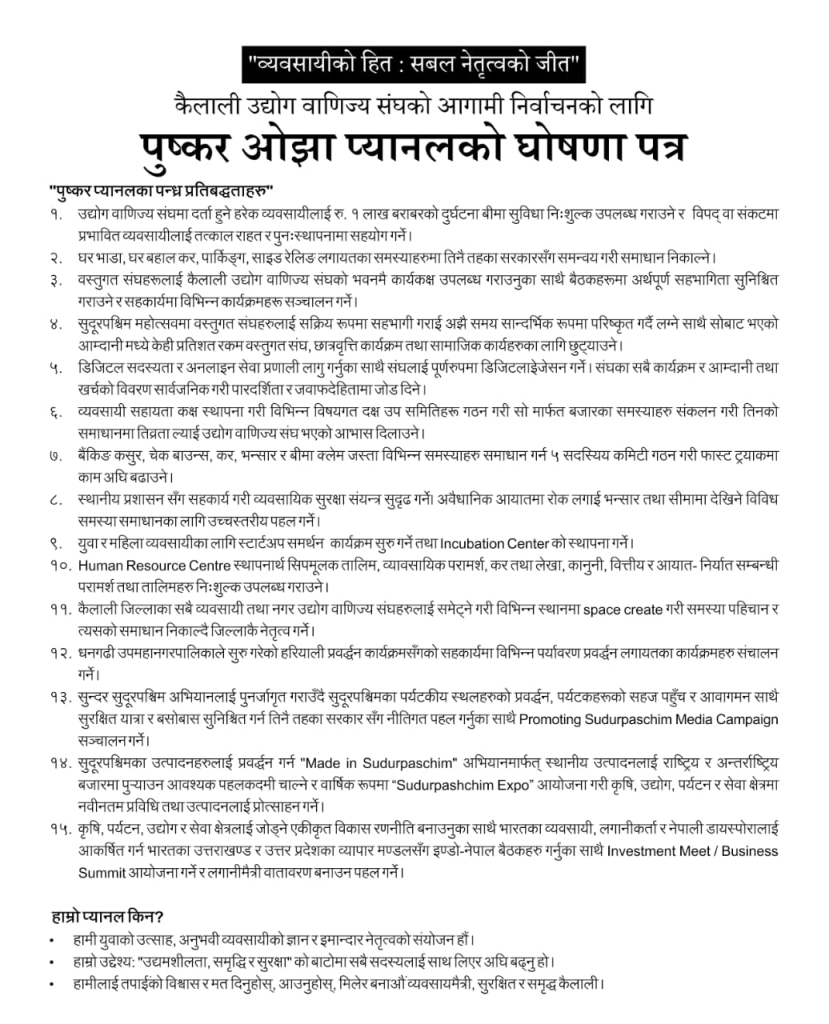 “व्यवसायीको हित, सबल नेतृत्वको जीत” भन्ने मुल नारासहित ओझा समूहले धनगढीमा पत्रकार सम्मेलनमार्फत १५ बुँदे घोषणापत्र सार्वजनिक गरेको हो। घोषणापत्रमा उद्योग व्यवसायीलाई दुर्घटना बीमा सुविधा निःशुल्क उपलब्ध गराउने, विद्युत् तथा संकट प्रभावित व्यवसायीलाई राहत तथा पुनःस्थापना कार्यक्रम सञ्चालन गर्ने, घर, पसल तथा गुदाममा सुरक्षा प्रणाली लागू गर्ने लगायतका कार्यक्रम समावेश छन्।