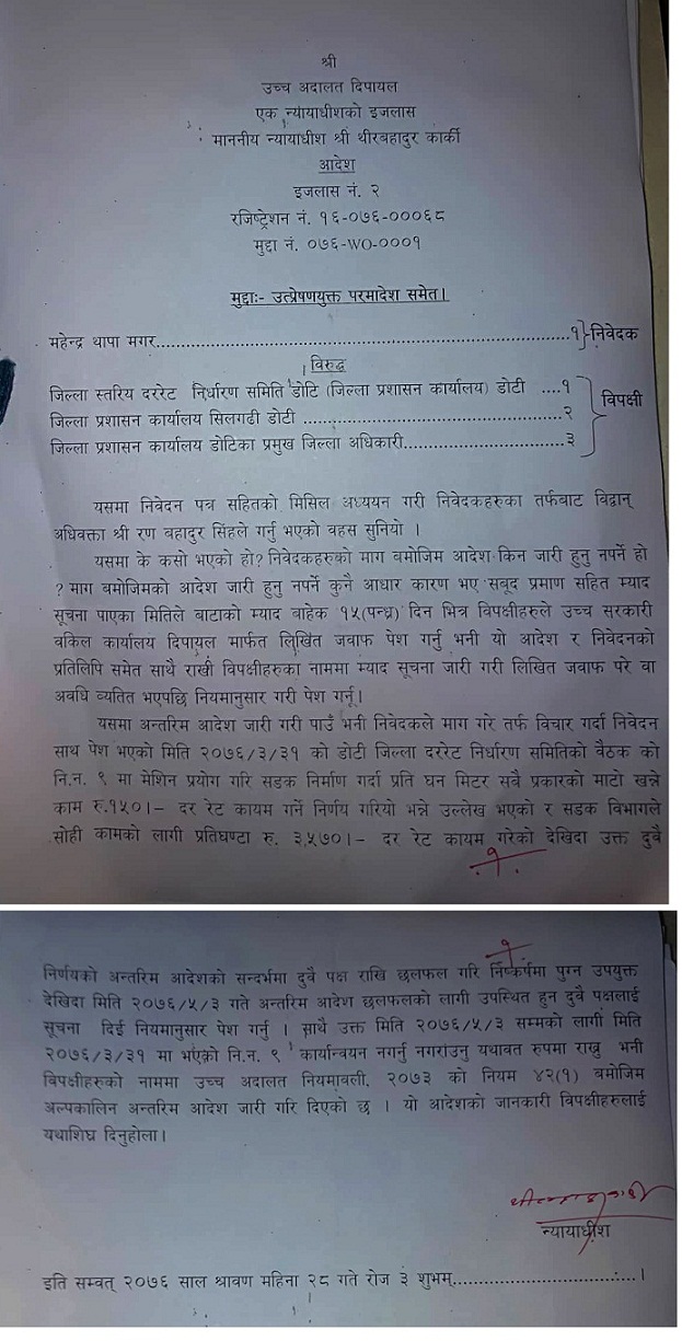 जिल्ला दररेट निर्धारण समितिको सडक निर्माण सम्बन्धी निर्णयविरूद्ध उच्च अदालत दिपायलमा मुद्दा दायर गरिएको छ ।