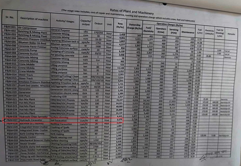 सडक विभागको २०७५ माघ १८ गतेको बैठकले ‘उपकरण स्वामित्व र परिचालन लागत दर निर्धारण सम्बन्धी निर्देशिका’तयार पारेको थियो । जसमा सडक निर्माणमा प्रयोग हुने एक्जाभेटर मेशिनको प्रतिघण्टा तीन हजार पाँच सय ७० रुपैयाँ तोकिएको छ । ‘ईष्टिमेट’मा सो मेशिनले एकघण्टामा ६० घनमिटर सडक खन्ने जनाईदा प्रतिघनमिटर मूल्य ५९ रुपैयाँ पचास पैसा हुन आउछ । यता सडक विभागकै ईष्टिमेटका आधारमा ‘६० घनमिटर प्रतिघण्टा काम हुन्छ’ मान्ने हो भने, जिल्ला दररेट निर्धारण समितिका दररेटमा काम गर्दा त्यो मेशिनलाई एक घण्टाको नौ हजार भूक्तानी दिनुपर्छ ।