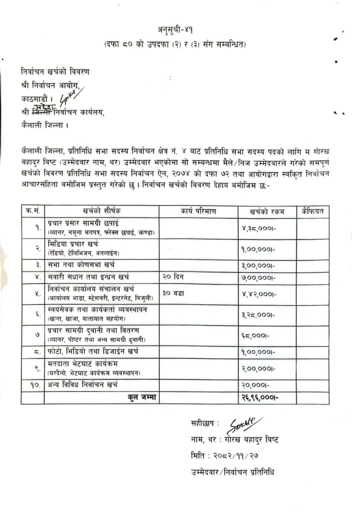 धनगढी : नेपाली कांग्रेसका तर्फबाट कैलाली निर्वाचन क्षेत्र नम्बर ४ का प्रतिनिधि सभा सदस्यका उम्मेदवार गोरखबहादुर बिष्ट ‘आनन्द’ ले निर्वाचन खर्च विवरण सार्वजनिक गरेका छन्।