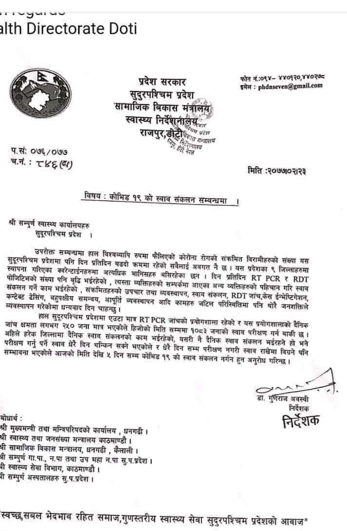 निर्देशक डा. गुणराज अवस्थीद्वारा हस्ताक्षरित पत्रमा सुदूरपश्चिम प्रदेशमा हाल एउटामात्रै ‘आरटीपीसीआर’ प्रयोगशाला रहेको र जसको दैनिक जाँच क्षमता दुईसय ५० नमुना मात्रै रहेको उल्लेख गर्दै एक हजार ८३ जनाको स्वाब परीक्षण गर्न बाँकी रहेको उल्लेख छ ।