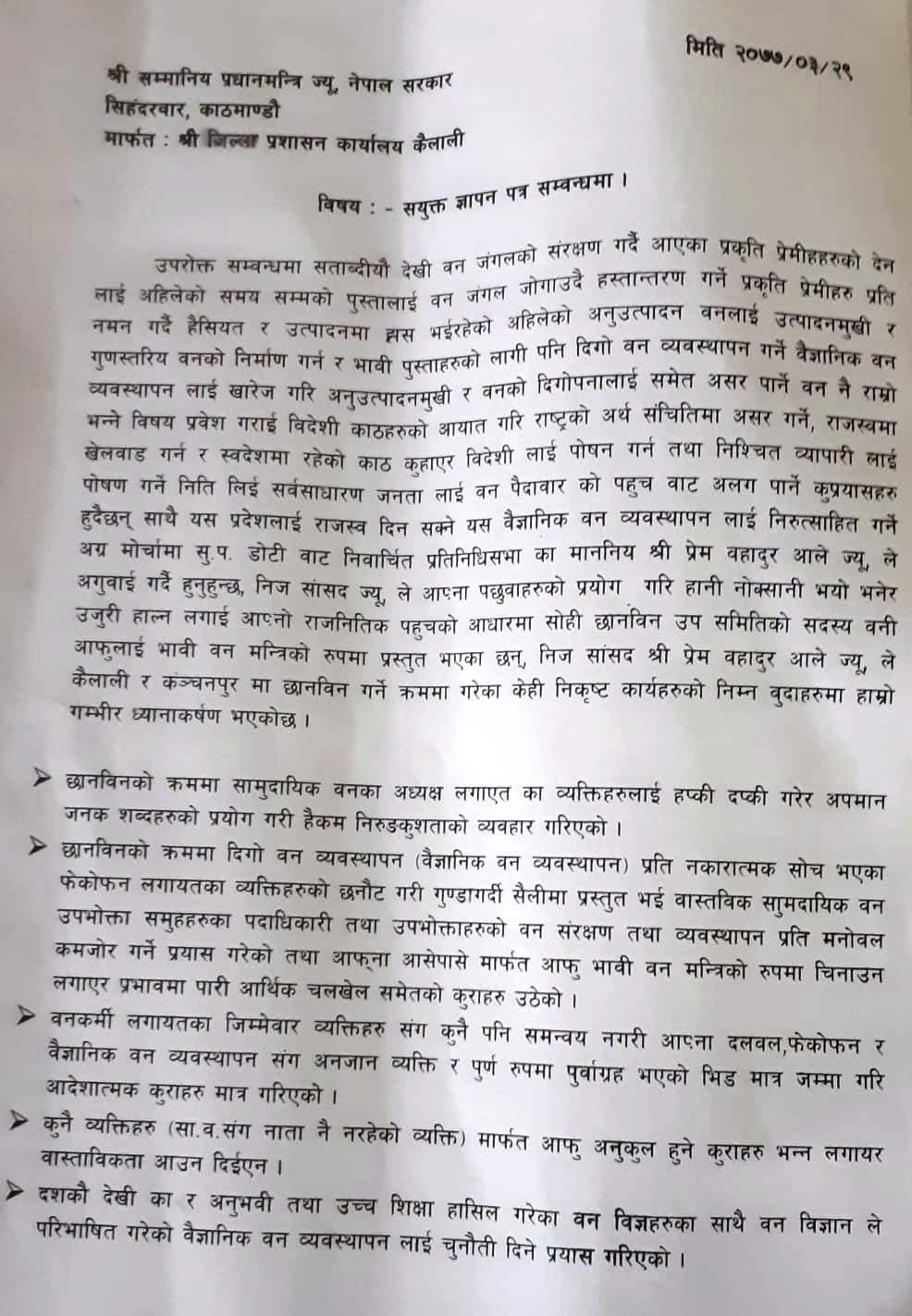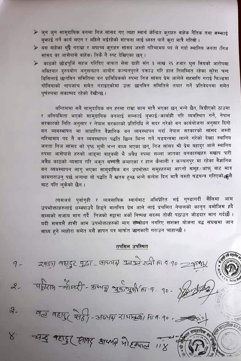 डिभिजन वन कार्यालय पहलमानपुर मातहतका २९ र धनगढी डिभिजन अन्तर्गतका ३९ सामुदायिक वनले संयुक्त रुपमा प्रमुख जिल्ला अधिकारीमार्फत प्रधानमन्त्रीलाई बुधबार ज्ञापनपत्र बुझाउँदै सांसद आलेलाई कारबाही र नयाँ उपसिमिति बनाएर छानबिन गर्न माग गरेका छन ।