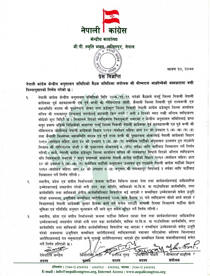 कांग्रेस अनुशासन समितिको शनिबार बसेको बैठकले जोशी र ओझालाई ५–५ वर्ष र विष्टलाई ३ वर्ष पार्टीबाट निष्कासन गर्ने निर्णय गरेको हो ।